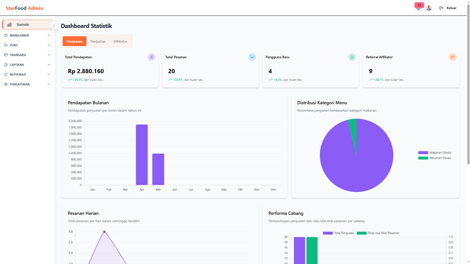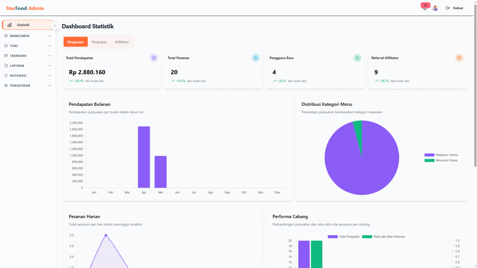 Ringkasan statistik penting (transaksi, produk, cabang, affiliate).